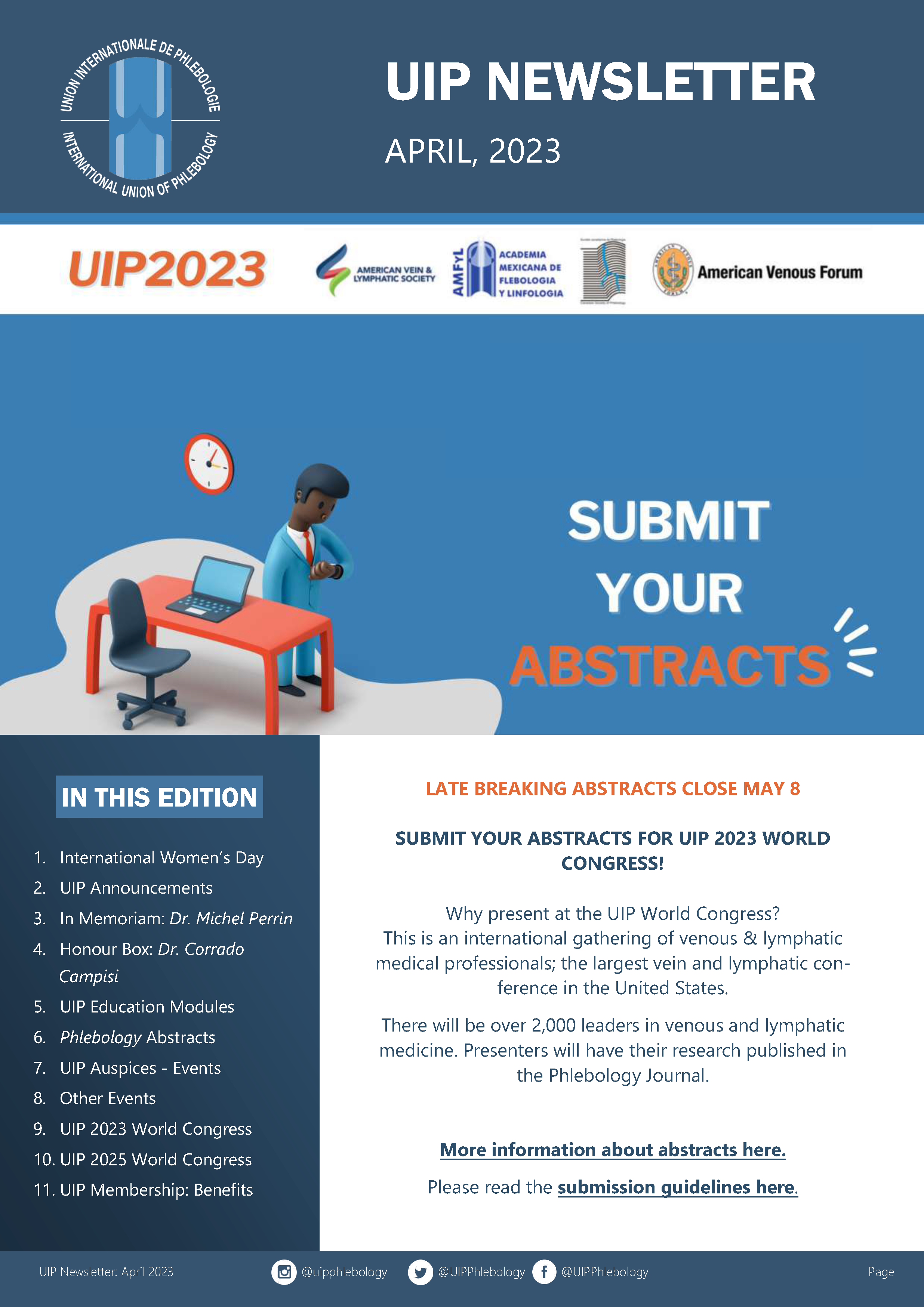 The UIP regularly products a newsletter that is distributed worldwide to its members and to those with an those with an interest in Phlebology. To receive the newsletter, please us the form below.